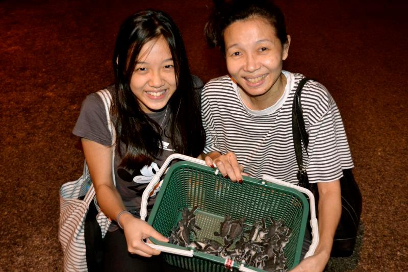 - Participants with a basket of newly-emerged sea turtle hatchlings