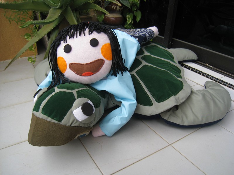The launch gimmick was quite a hit. Thanks again to Joanne Low of MPH who gave me the idea. It took me almost 3 days to complete sewing the meter long turtle and Maya, improvising as I went along. Here is the end result: