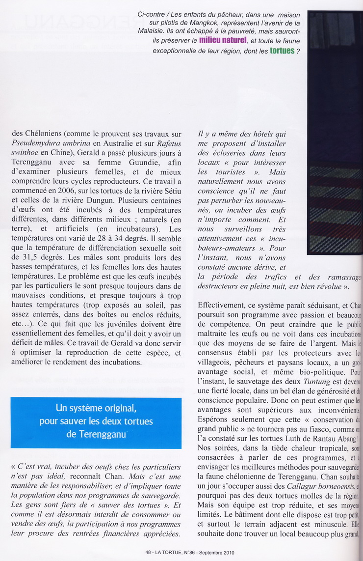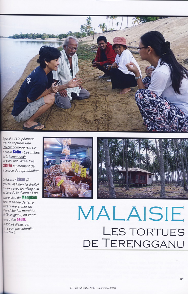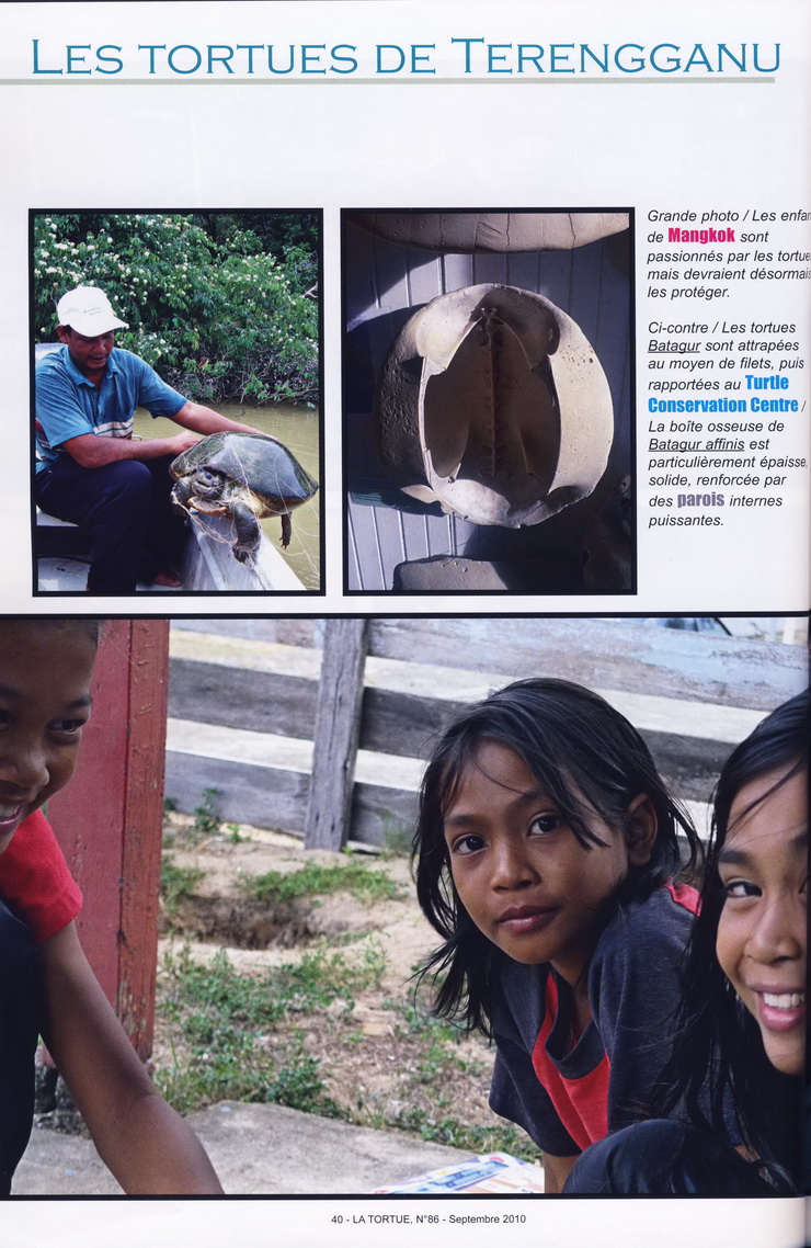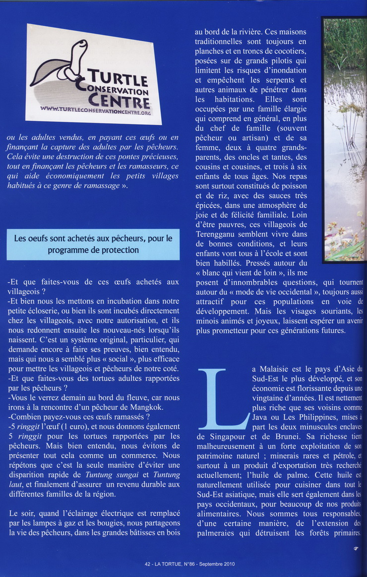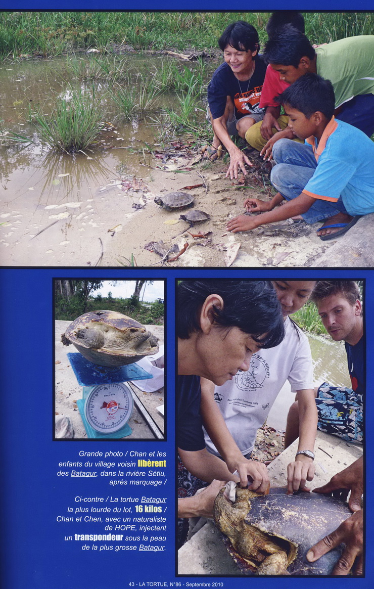 … Bernard Devaux was met by Chan Eng Heng and her colleague Chen Pelf Nyok, and we headed for Mangkok, to see the work the two scientists had been doing on two very unusual and relatively threatened turtles, Batagur affinis and Batagur borneoensis. Turtle Conservation Centre is a small but attractive traditional wooden building on stilts. Visiting Malays and tourists can tour a small, beautifully arranged museum and see the conservation work the team is doing. The problem is that for many years, the villagers have been eating the eggs of these species. The idea of TCC is to counter this, saving the eggs by buying them from fishermen and egg collectors. The eggs are then incubated and the juveniles released into the wild. This helps preserve the two species. We helped Chan in her work with a fisherman who brought her turtles collected from the river. The turtles were marked, weighed, then immediately released. In this way, the fisherman earns a living, while the turtles are spared. It’s good work for the locals and the only employment available in the area since the villagers are accustomed to use the turtles for both food and earn a little cash…