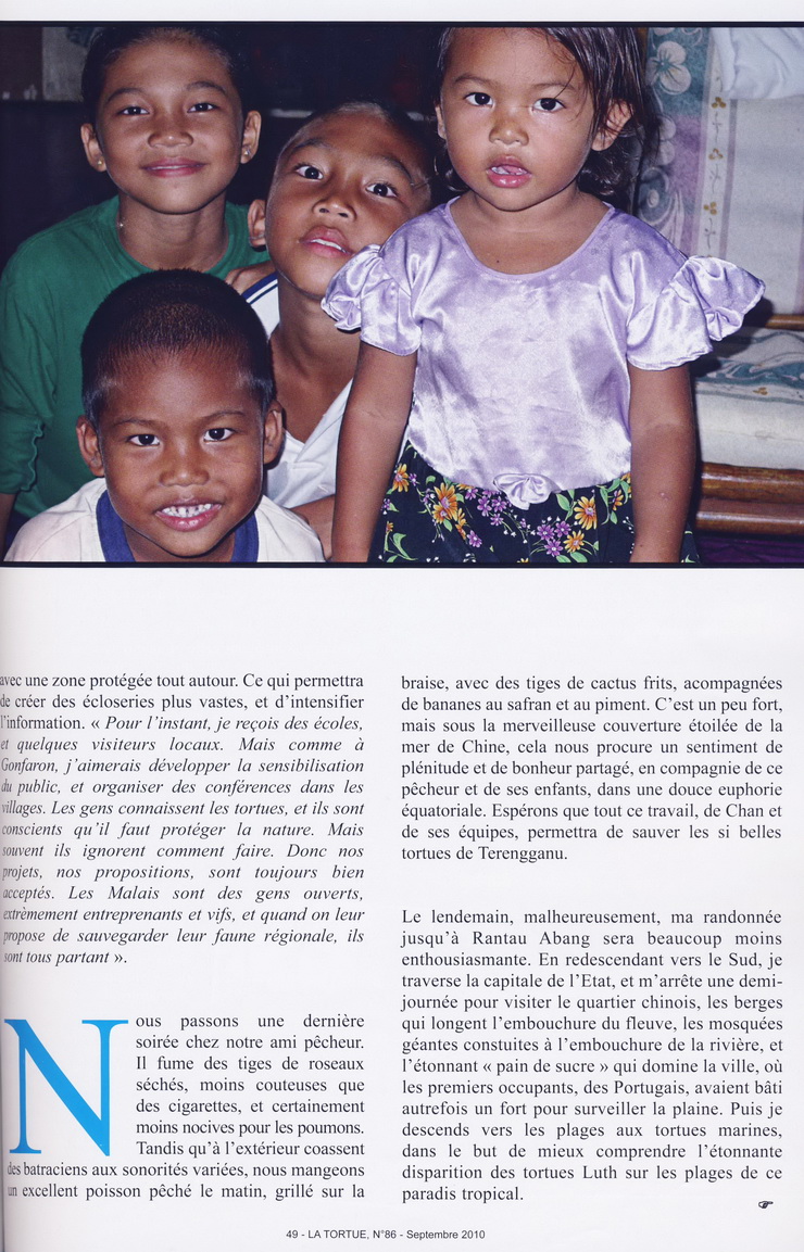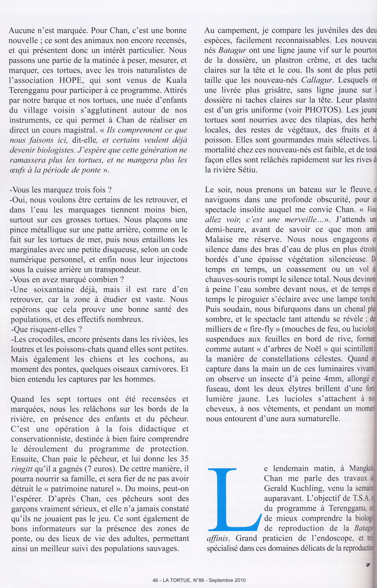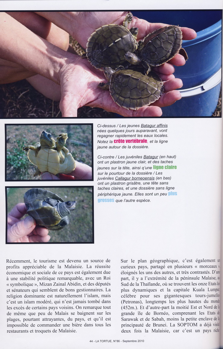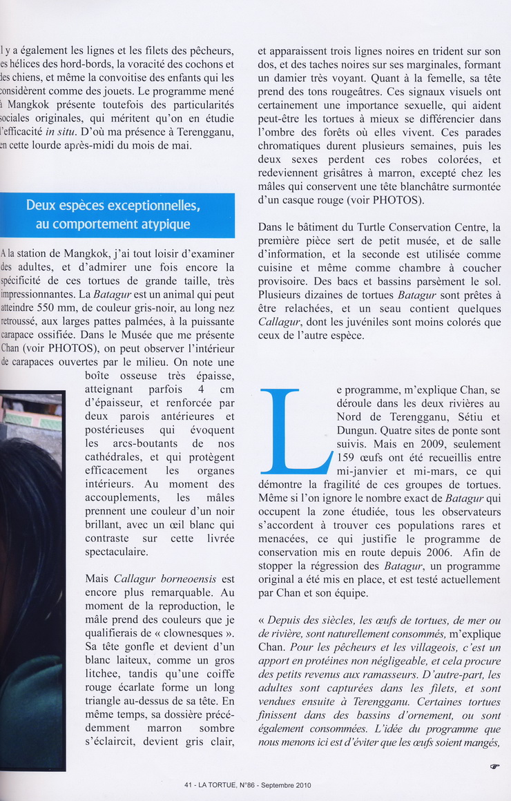 … Bernard Devaux was met by Chan Eng Heng and her colleague Chen Pelf Nyok, and we headed for Mangkok, to see the work the two scientists had been doing on two very unusual and relatively threatened turtles, Batagur affinis and Batagur borneoensis. Turtle Conservation Centre is a small but attractive traditional wooden building on stilts. Visiting Malays and tourists can tour a small, beautifully arranged museum and see the conservation work the team is doing. The problem is that for many years, the villagers have been eating the eggs of these species. The idea of TCC is to counter this, saving the eggs by buying them from fishermen and egg collectors. The eggs are then incubated and the juveniles released into the wild. This helps preserve the two species. We helped Chan in her work with a fisherman who brought her turtles collected from the river. The turtles were marked, weighed, then immediately released. In this way, the fisherman earns a living, while the turtles are spared. It’s good work for the locals and the only employment available in the area since the villagers are accustomed to use the turtles for both food and earn a little cash…