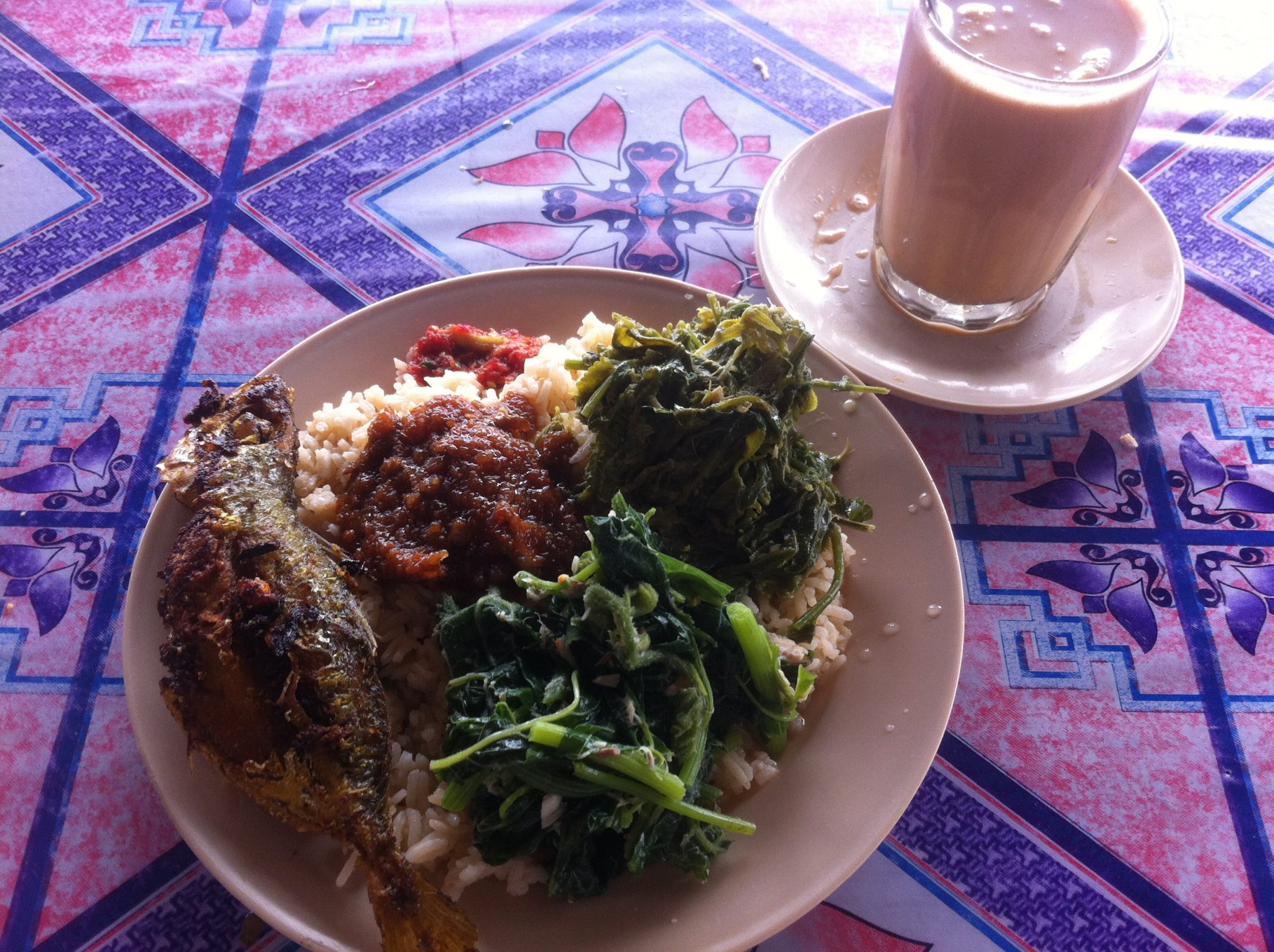 At about 1pm, we broke for a quick lunch break at a nearby “gerai kaki lima” (translated: roadside stall): authentic-motherly-home-cooked-grub!, super-cheap and fresh, as they’re operating under a tree and right beside the Kuala Berang main market. This is what I had and for the 3 of us (similar portions and fish & veg taken) only came up to RM14.30 with RM2 “keropok lekor” (fried fish fingers) & fried cempedak inclusive!