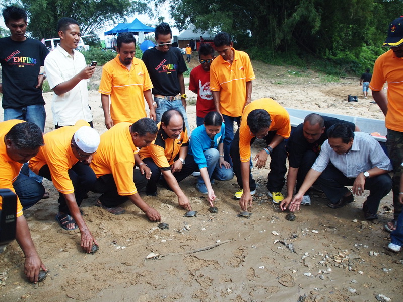 The Village Headman, En. Wan Mamat b. Wan Ismail, has been raising the eight hatchlings for seven weeks before they were released in conjunction with Karnival Emping (harvest festival) which was held at the village on the 29th July 2011. At the time of release, the hatchlings had an average weight of 127 g, and average length and width of 9.2 cm and 8.8 cm, respectively.