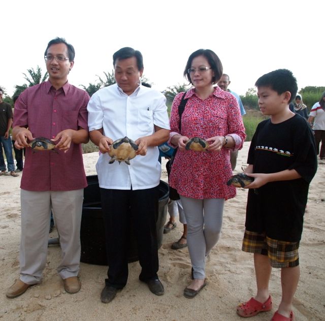 - Y.B. Wan Hakim, Y.B. Dato Toh, To Puan Sea and Callum, getting ready to release their terrapins.