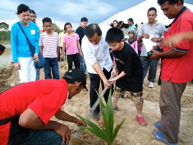 - Y.B. Dato Toh and his son, Callum, planting a tree as a symbolic gesture.