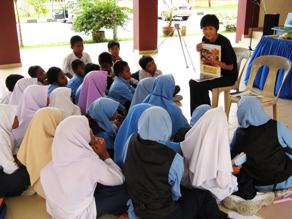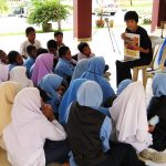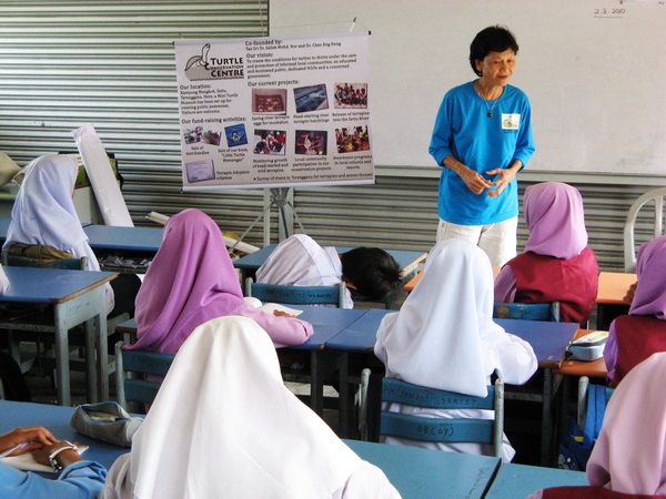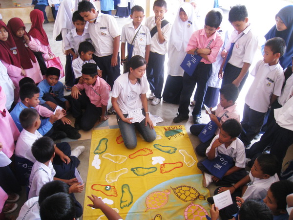 Only Standard 5 students (11-year-olds) were involved in the program, except in schools with a small enrollment, where the Standard 6 students (12-year-olds) were included too. Each student received a home-made cloth bag to promote the use of a reusable bag; a copy of “Duta Kecil Penyu” (the Malay version of Little Turtle Messenger); an Activity Book that contains information about the Turtle Conservation Centre and what we do, information about sea turtles that nest in Malaysia and the critically-endangered terrapins in Terengganu; and a badge.