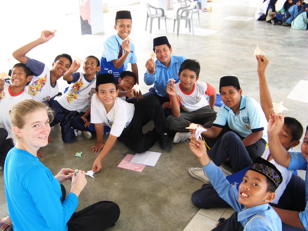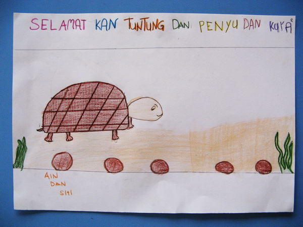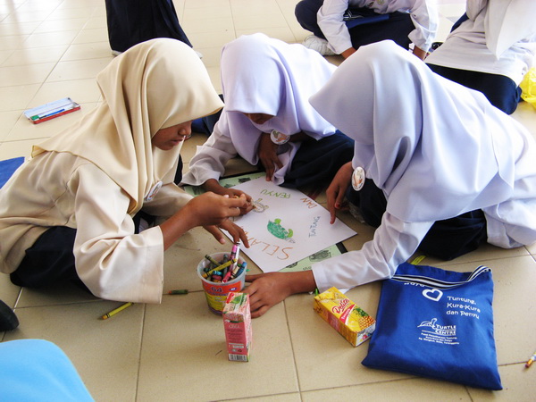 The Turtle Camp resumes after the break and the students are engaged in two activities concurrently, and whenever we are done with an activity, we switch to the other. The activities that were carried out included poster-drawing, playing the Terrapin Action Game in which students are required to act out scenarios written on flash cards, a crossword puzzle based on the book “Duta Kecil Penyu” and turtle origami, but only two of these activities were carried out in each school due to the time constraint. The Terrapin Action Game and turtle origami were the favourites among the students.