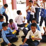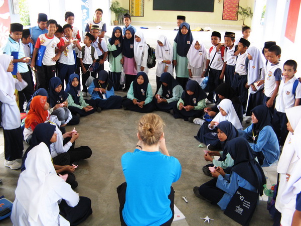 After that, we break the students up into smaller groups and tell the story of Maya and her journey to the world of the turtles underwater. After the story-telling session, the students are given a boxed drink and we take a 10 to 15 minutes break.