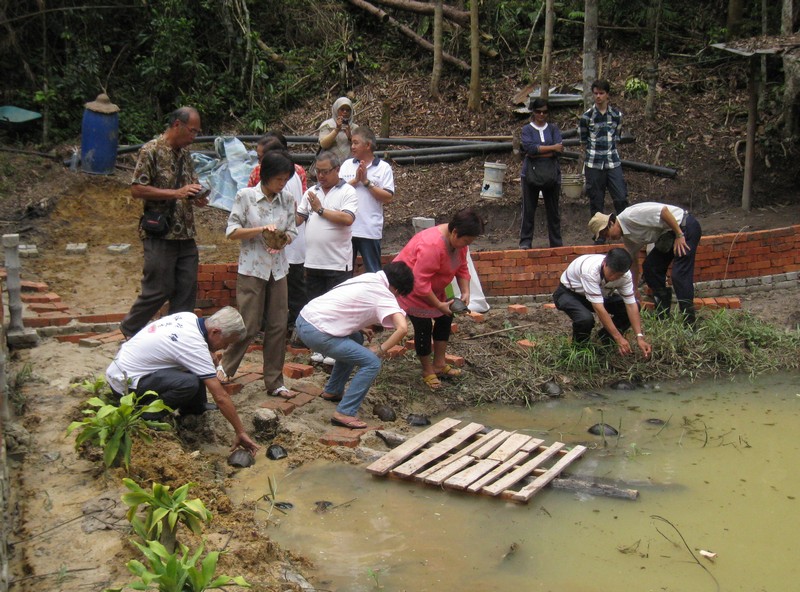 We had to build a concrete fence around the large pond in the organic park to prevent the turtles from escaping into Dr. Ng’s organic vegetable plots. This was a costly and time consuming task, but thanks to Dr Ng’s workers and funds donated by the Sam Poh Tong Temple, Lim Puay Aun, Chan Kean Eng and Chan Eng Heng, the fence was completed in time for the release that took place on 1 May 2011.